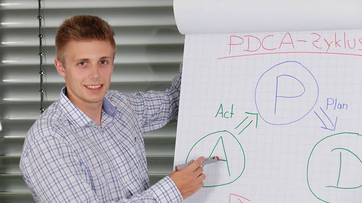 Tout a commencé en 2013 avec un simple travail de vacances chez HOMA. Fabian Goliasch a ensuite été embauché comme stagiaire et le premier employé qui a commencé un double cursus en « gestion industrielle » à l'EuFH de Brühl parallèlement à son emploi chez HOMA. Après un semestre à l'étranger à Dublin et après avoir terminé ses études, il est responsable de la gestion énergétique de notre société depuis juillet 2017.